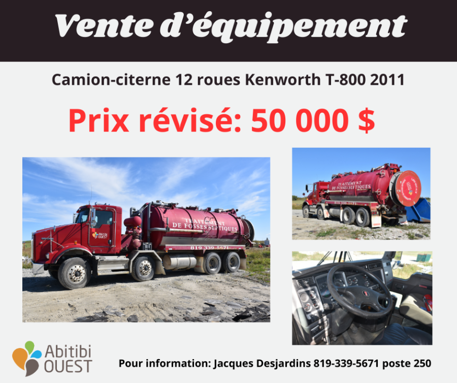 La Municipalité régionale de comté (MRC) d’Abitibi-Ouest annonce la vente du camion-citerne 12 roues Kenworth T-800 2011.